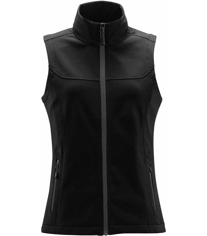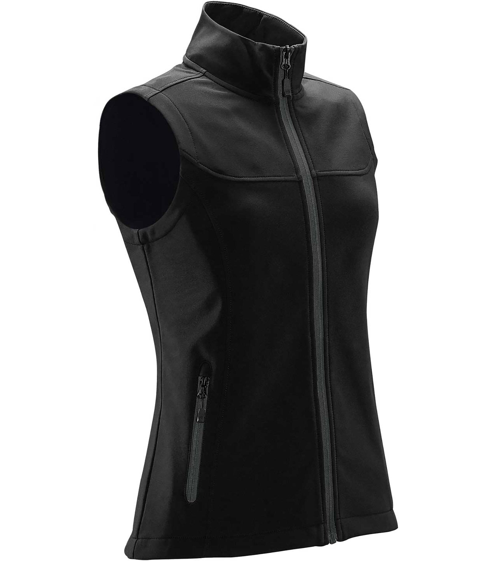 Softshellväst i mjukt väderbeständigt material, med vattenavvisande tyg som mellanskikt och invändigt fleecefoder.